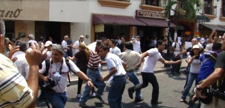 Cuando estaban a punto de llegar al cruce de las calles Madero y Álvaro Obregón fueron interceptados por un grupo de individuos que de inmediato se lanzaron a golpes contra los integrantes del contingente.