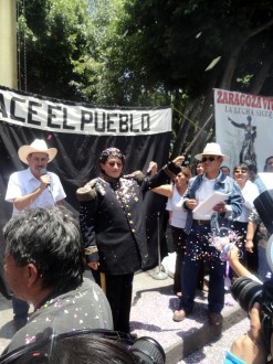 Con uniforme militar y montado a caballo, la personificación de Zaragoza partió desde la zona de Los Fuertes, que fue el escenario de la heroica Batalla, y llegó hasta el Zócalo para repudiar la participación del presidente Felipe Calderón en este festejo de la soberanía nacional, cuando el actual gobierno entrega a transnacionales extranjeras los bienes nacionales.