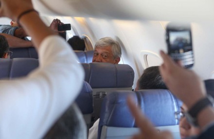 A BORDO DEL AVIÓN (apro).- El mitin duró 10 minutos y lo hizo desde su asiento 6C del vuelo 2596 de Aeroméxico: mientras la aeronave volaba a 36 mil pies de altura, Andrés Manuel López Obrador recibía aplausos y porras de los viajeros que lo alentaban a seguir su campaña y ganar el 1 de julio próximo.