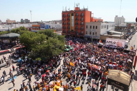 López Obrador arribo al Zócalo de esta ciudad sin más protección que la acostumbrada, a pesar de que se trata de una de las ciudades con mayores índices de violencia por los enfrentamientos entre el Cartel del Golfo y los Zetas.