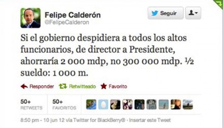 MÉXICO, D.F. (apro).- Desde su cuenta de Twitter, el presidente Felipe Calderón aclaró cuánto se ahorraría realmente al eliminar parte de la alta burocracia del gobierno federal, cifra que señaló el candidato del Movimiento Progresista, Andrés Manuel López Obrador.
