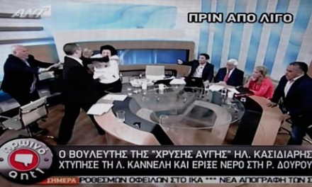 Kasidiaris se va contra ella y le propina tres violentas bofetadas antes de que un hombre intervenga para detenerlo y que la señal del programa sea cortada.