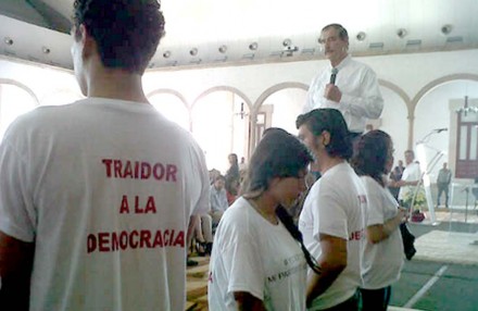 Iniciada la conferencia, un asistente del público le gritó “chachalaca” al expresidente. El asunto no pasó a más. Sin embargo, media hora después aparecieron una decena de jóvenes vestidos con playeras blancas y la leyenda “traidor a la democracia”, inscrita en letras mayúsculas de color rojo.