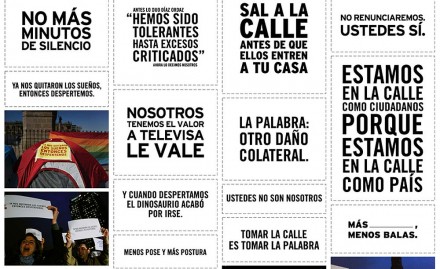 Otros son testimonio de la desesperanza de una generación: “Ya nos quitaron los sueños, entonces despertemos”. “No más minutos de silencio”. “Los muertos no pudieron venir, yo sí”. “¿Miedo? Sólo al silencio”; “NI les creo, NI les creeré”. “Yo tenía un país”.