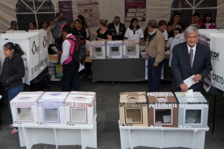 Acompañado de sus cuatro hijos, José Ramón, Andrés Manuel y Gonzalo y Jesús Ernesto, y su esposa Beatriz Gutiérrez, elexjefe de gobierno capitalino llegó a las 8 horas a la casilla casilla 1234 de la delegación Coyoacán donde le tocó el lugar once de la fila y pudo votar alrededor de una hora después.
