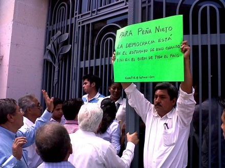 CHILPANCINGO, Gro., (apro).- El gobernador Ángel Aguirre Rivero fue sorprendido por una protesta espontánea de un ciudadano que portando una pancarta se manifestó en contra del resultado electoral que beneficia al candidato presidencial del PRI, Enrique Peña Nieto.