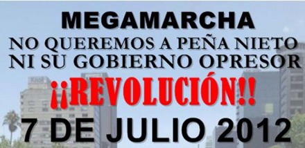 “No queremos a Peña Nieto ni su gobierno opresor ¡Revolución! 7 de julio 2012 Ángel de la Independencia, Plazas públicas de todo el país. 3:00 pm”