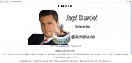 Un integrante de Anonymous identificado con el nombre de @jamzanon se adjudicó el hackeo de la web de PRI-DF. El activista cibernético colocó una foto de Peña Nieto, acompañada de la siguiente leyenda: “Felicidades ‘espurio’”.