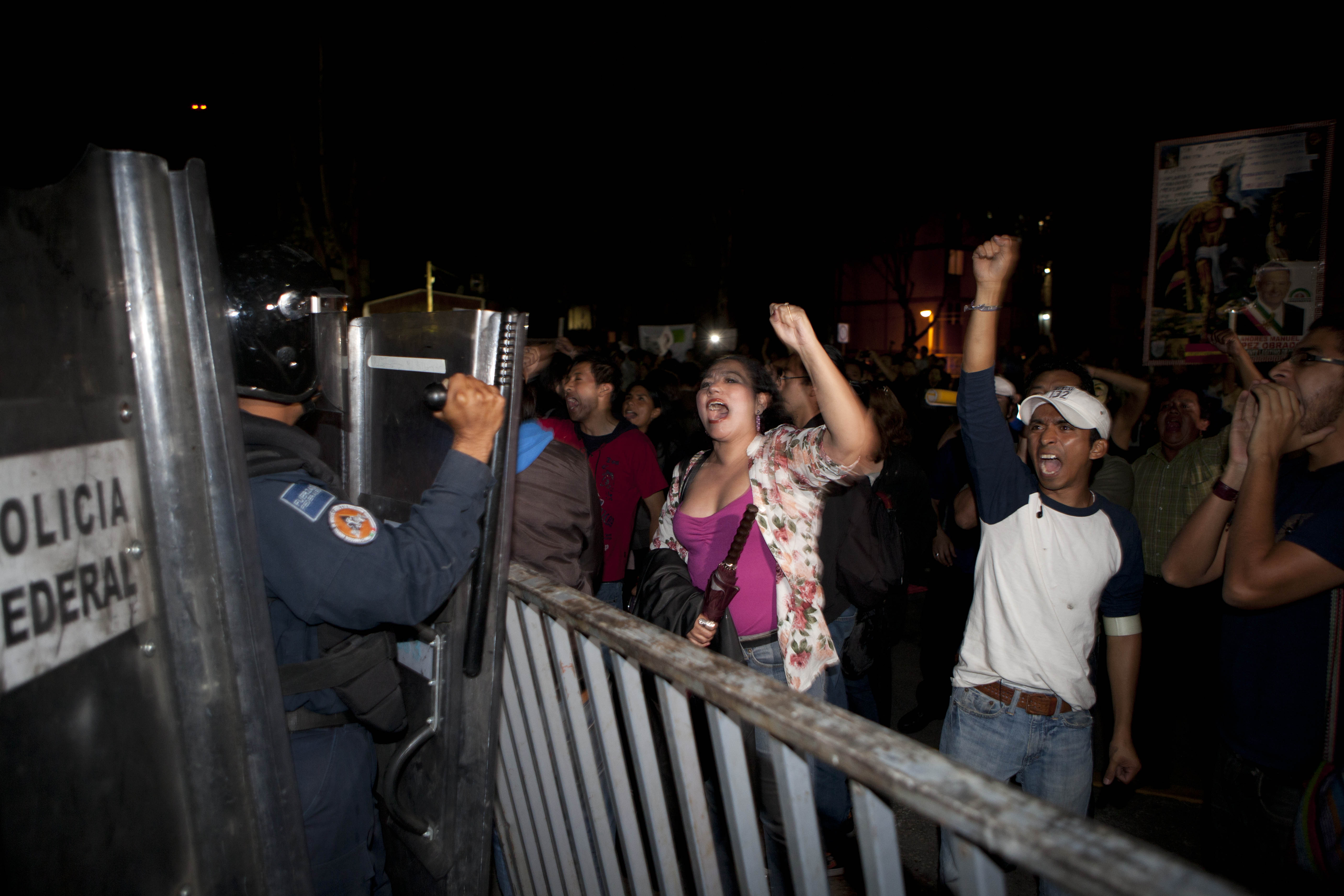 A las 17:00 horas, cuando inició la sesión del TEPJF ya había decenas de manifestantes que seguían desde afuera el desarrollo del juicio. A las 20:45 horas fue cuando decenas de manifestantes derribaron algunas de las vallas que habían sido colocadas alrededor del Tribunal y de inmediato policías preventivos protegidos con escudos se formaron en fila para evitar el paso de los inconformes.
