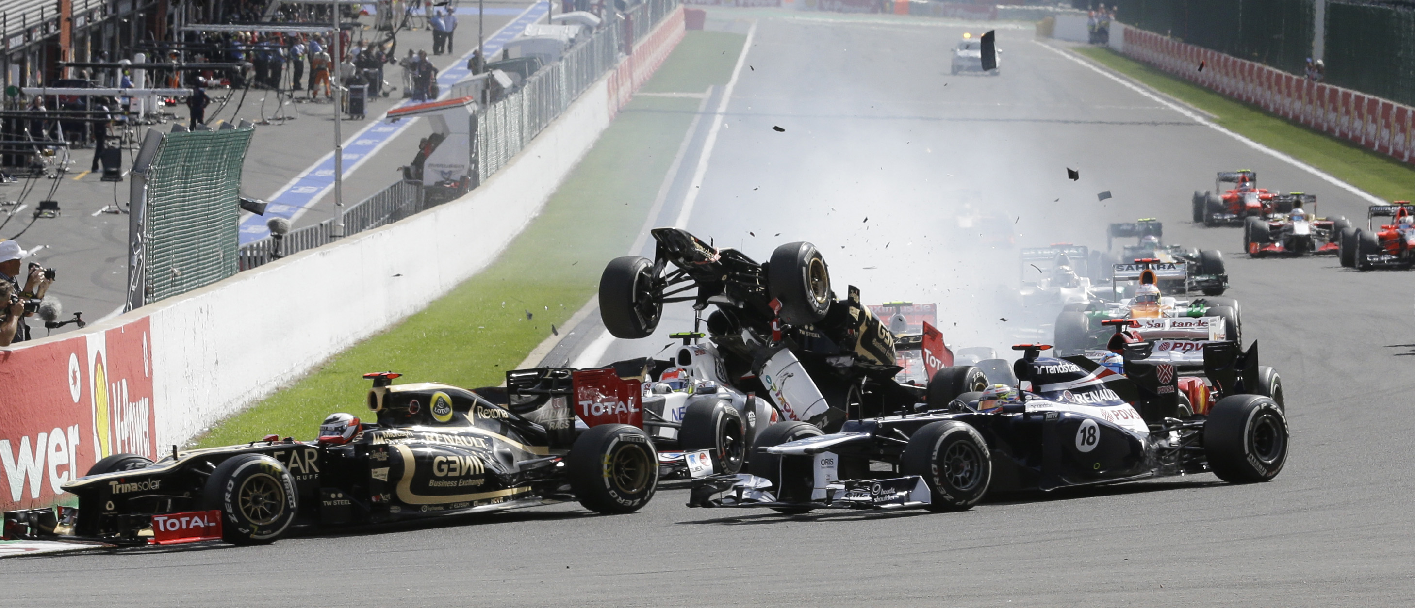 El accidente se produjo en la primera curva del circuito de Spa-Francorchamps: Grosjean chocó con Hamilton (McLaren) al frenar en la primera curva y su Lotus voló por encima del Ferrari de Alonso, que también fue embestido por el monoplaza del británico.