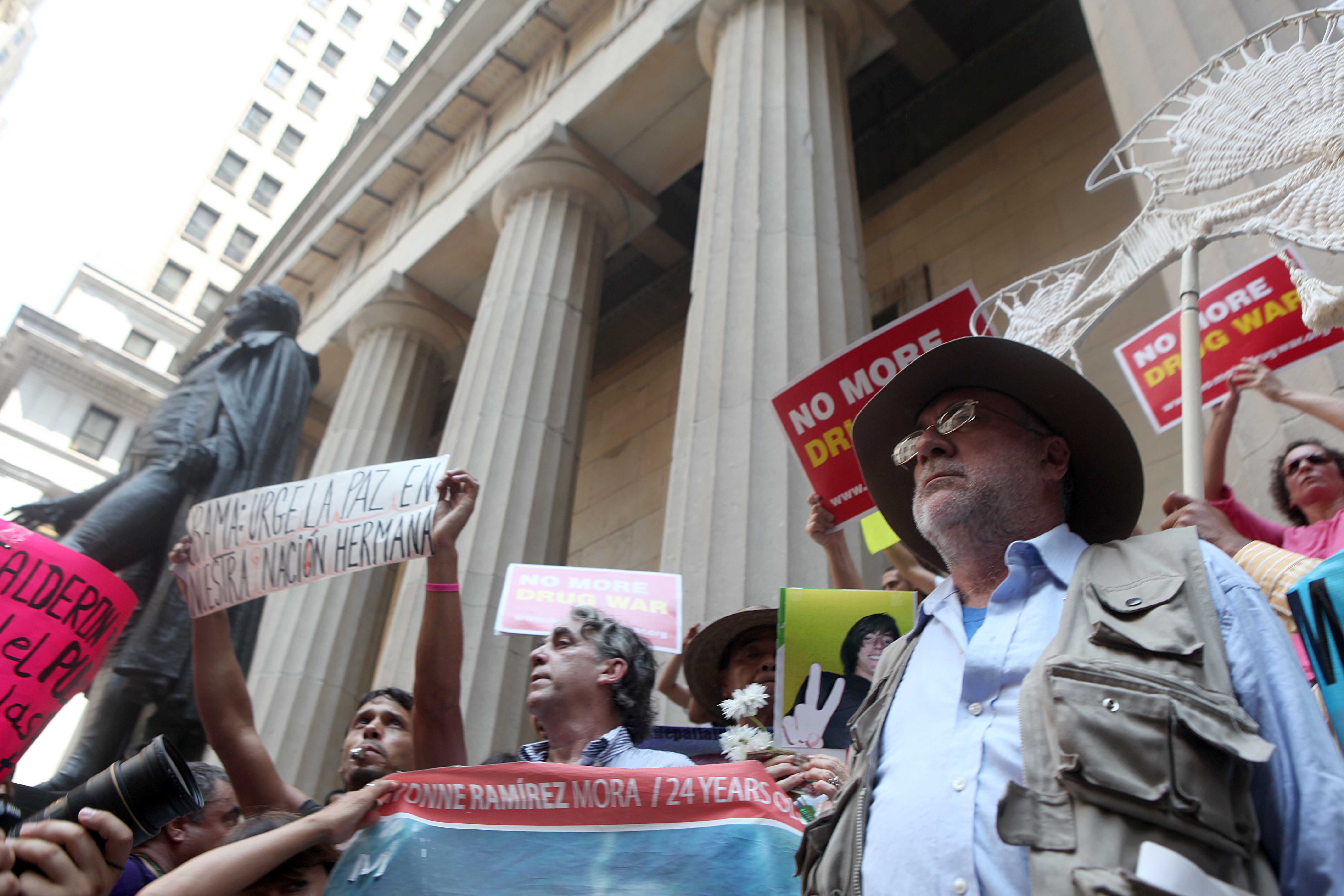 Frente a las oficinas de HSBC en el distrito financiero de Nueva York, Sicilia intentó abrir una cuenta bancaria con billetes manchados de sangre, como una forma simbólica de protesta. No obstante, los guardias no se le permitieron.
