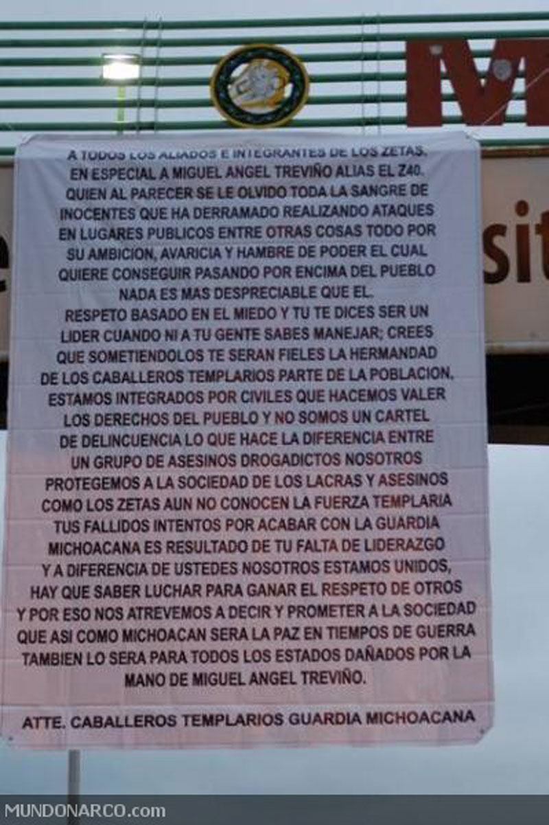 “A TODOS LOS ALIADOS E INTEGRANTES DE LOS ZETAS, EN ESPECIAL A MIGUEL ÁNGEL TREVIÑO, EL ZETA 40, QUE SE TE OLVIDO TODA LA SANGRE DE INOCENTES QUE A DERRAMADO REALIZANDO A TAQUES EN LUGARES PÚBLICOS, ENTRE OTRAS COSAS TODO POR SU AMBICIÓN, AVARICIA Y HAMBRE DE PODER, EL CUAL QUIERE CONSEGUIR PASANDO POR ENCIMA DEL PUEBLO NADA ES MAS DESPRECIABLE QUE EL RESPETO BASADO EN EL MIEDO Y TU TE DICES LÍDER CUANDO NO SABES MANDAR A TU GENTE, CREES QUE SOMETIÉNDOLOS TE SERÁN FIELES, LA HERMANDAD DE LOS CABALLEROS TEMPLARIOS NO ES PARTE DE LA POBLACIÓN ESTAMOS INTEGRADOS POR CIVILES QUE HACEMOS VALER LOS DERECHOS DEL PUEBLO Y NO SOMOS UN CARTEL DE DELINCUENCIA LO QUE HACE LA DIFERENCIA DE UN GRUPO, ASESINOS DROGADICTOS, NOSOTROS PROTEGEMOS A LA SOCIEDAD DE LAS LACRAS Y ASESINOS COMO LOS ZETAS, AUN NO CONOCEN LA FUERZA TEMPLARÍA, TUS FALLIDOS E INTENTOS POR ACABAR CON LA GUARDIA MICHOACANA ES RESULTADO DE TU FALTA DE LIDERAZGO Y A DIFERENCIA DE DE USTEDES, NOSOTROS ESTAMOS UNIDOS HAY QUE SABER LUCHAR PARA GANARSE EL RESPETO DE OTROS, Y POR ESO NOS ATREVEMOS A DECIR Y APROMETER A LA SOCIEDAD QUE ASÍ COMO MICHOACÁN SERÁ PAZ EN TIEMPOS DE GUERRA, TAMBIÉN LO SERÁ PARA LOS ESTADOS DAÑADOS POR LA MANO DE MIGUEL ÁNGEL TREVIÑO. ATENTAMENTE LOS CABALLEROS TEMPLARIOS GUARDIA MICHOACANA” (sic).