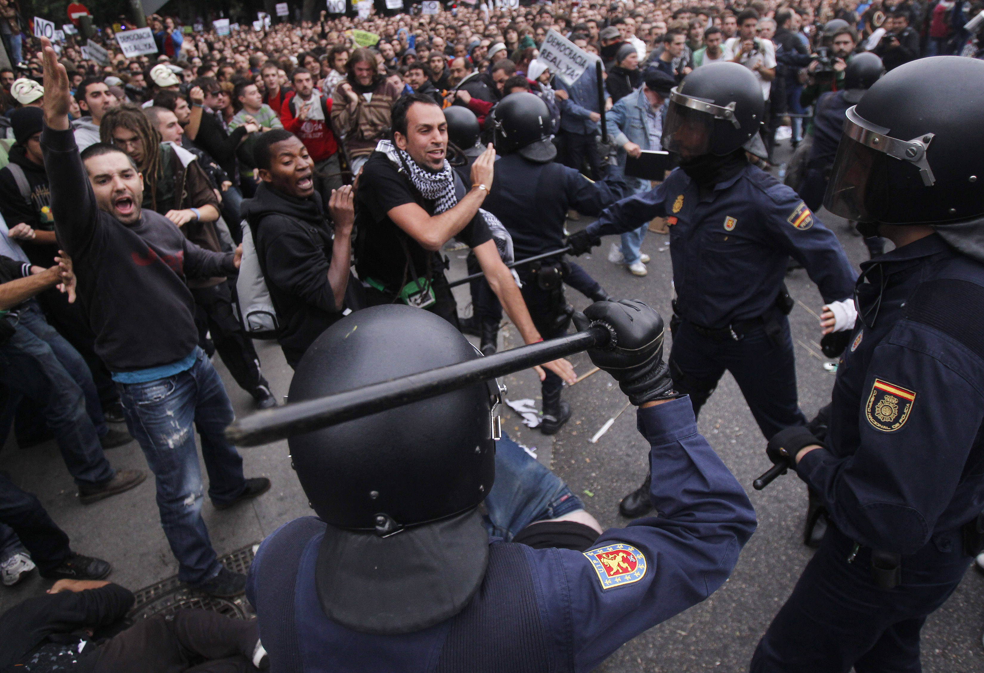 MADRID (apro).- En una larga jornada de manifestaciones, bajo el lema “Rodea el Congreso”, esta noche persiste la tensión y los choques ofensivos de la policía antidisturbios contra miles de manifestantes reunidos en las inmediaciones del Congreso de los Diputados, a quien le exigen la disolución de las Cortes –Gobierno y Congreso– por los duros recortes económicos y por considerar que no los representan.