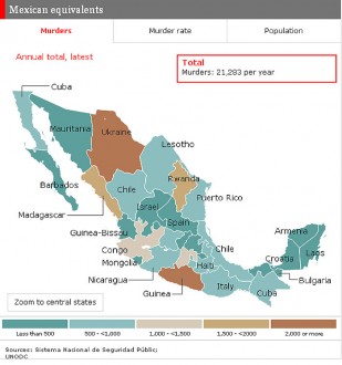 “La tasa de homicidios se ha duplicado en los últimos cinco años. Para dar idea de cómo los estados de México son más seguros o peligrosos, se han comparado con las estadísticas de delincuencia de otros países”, explica el semanario.