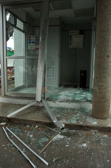 La zona fue acordonada mientras se esperaba la llegada del representante jurídico del banco para remover la puerta y los vidrios dañados.