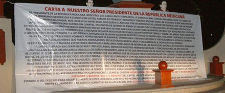 Por su parte, el grupo delictivo denominado Los Caballeros Templarios dirigió un mensaje al presidente, en el que anunció que están dispuestos a “deponer las armas”, siempre y cuando Peña Nieto cumpla las promesas de campaña; y “ofrecieron su ayuda” para eliminar a sus grupos antagónicos: Los Zetas y el cártel de Jalisco Nueva Generación.