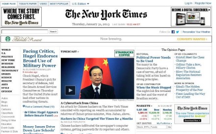 MÉXICO, D.F. (apro).- El diario The New York Times denunció que hackers chinos, algunos de ellos militares, se infiltraron en sus redes informáticas en los últimos cuatro meses, para buscar archivos relacionados con la investigación que el rotativo hizo en octubre pasado sobre el vertiginoso enriquecimiento de la familia del primer ministro Wen Jibao.