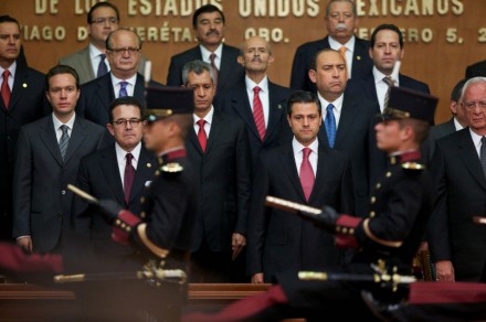 En el Teatro de la República, acompañado por los representantes del Senado, Ernesto Cordero Arroyo; de la Cámara de Diputados, Franciso Arroyo, y del Poder Judicial, Juan Silva Meza, así como de gobernadores, Peña Nieto dio paso a su mensaje sobre el Congreso Constituyente.