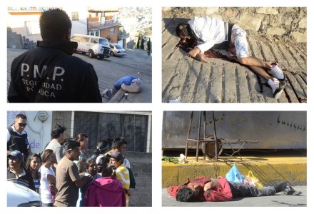 En tanto, en el municipio de Naucalpan, aparecieron dos jóvenes ejecutados con disparos en la cabeza. El primer cadáver se localizó en la calle Díaz, de la colonia San Lorenzo Totolinga, y presentaba dos disparos en la cabeza. Tenía aproximadamente 25 años. El cuerpo estaba hincado y reclinado sobre la banqueta; una sudadera le cubría la cara. El joven vestía un pantalón de mezclilla, zapatos y suéter color beige, y playera azul, pero no ha sido identificado.