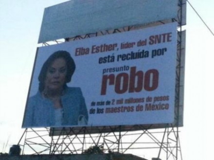 MÉXICO, D.F. (proceso.com.mx).- Tres espectaculares fueron colocados este fin de semana en la ciudad de Villahermosa en contra de la exlideresa del Sindicato Nacional de Trabajadores de la Educación (SNTE), Elba Esther Gordillo, en los que se destaca el presunto desvío de recursos que realizó en perjuicio del gremio magisterial.