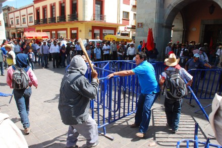 Amparados en el paro de 48 horas que este lunes iniciaron maestros de la Sección 22 del Sindicato Nacional de Trabajadores de la Educación (SNTE), miembros del FPR atacaron con palos a la policía estatal que resguardaba con vallas metálicas el corredor de Palacio de Gobierno, para exigir la libertad de tres de sus militantes y el esclarecimiento de algunos homicidios.