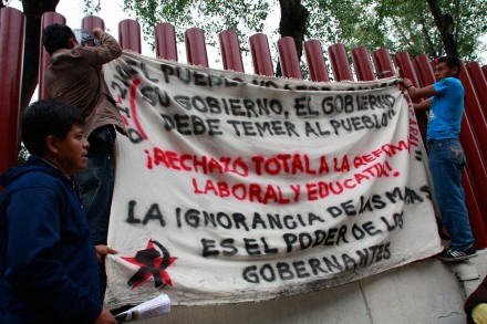Al término de su conferencia, la funcionaria de origen búlgaro tuvo un encuentro con los medios de comunicación, que le preguntaron su opinión sobre la movilización de los maestros de buena parte del país en contra de la reforma.