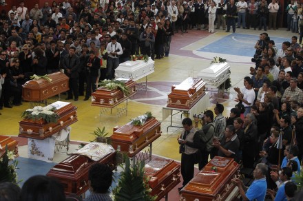 El obispo de Tlaxcala, Francisco Moreno Barrón, ofició esta tarde una misa ante los féretros de 13 víctimas.