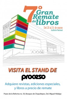 MÉXICO, D.F. (proceso.com.mx).- Para cumplir con el programa Fomento a la lectura, la Secretaría de Cultura del Distrito Federal ha organizado el Gran remate de libros en el Auditorio Nacional. Así que las editoriales del país se han unido para vender varios de sus títulos a precios especiales. Aquí encontrará en el stand 63 a Proceso, donde podrá conseguir la revista actual, ediciones pasadas, números especiales, artículos promocionales (Calendario 2013, USB, tazas) y libros editados por este semanario (de las colecciones “Crimen Organizado” y “Momentos de México”). Par aprovechar la barata se puede asistir a este espacio, ubicado en Avenida Reforma 50, el sábado 30 y domingo 31 de marzo de las 11 a las 19 horas.