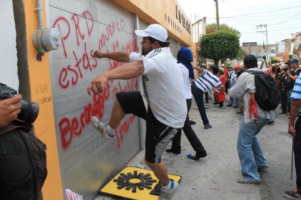 CHILPANCINGO, Gro. (proceso.com.mx).- A un día de que fueran desalojados por agentes federales tras bloquear la autopista del Sol, integrantes de la Coordinadora Estatal de Trabajadores de la Educación en Guerrero (CETEG) y normalistas se manifestaron nuevamente en esta capital donde destrozaron la sede estatal del PRD y condenaron la actitud asumida por el gobernador de izquierda, Ángel Aguirre Rivero y el presidente del Congreso local, el diputado perredista Bernardo Ortega Jiménez, quien fue llamado “narco diputado”.