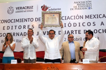 “Porque sus opiniones y demandas enriquecen y fortalecen la petición de la Asociación Mexicana de Editores de Periódicos de impulsar leyes y acciones que garanticen la libre expresión y una prensa responsable que mantenga debidamente informada a la ciudadanía. En la AME continuaremos apoyando a la Comisión Estatal de Atención y Protección a Periodistas de Veracruz y al gobierno de Javier Duarte de Ochoa con el relanzamiento del Colegio de Periodistas, esperando que su ejemplo pueda permear a otras entidades, con el firme propósito de que se traduzca, de las palabras a los hechos, la defensa constante de los periodistas y medios impresos.”