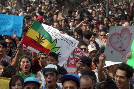 Las consignas invitan a jugar a los viajes y a apretar los párpados: “No al narco, sí al autocultivo”. “Yo soy pacheco, si te gusta la mota, apaga la tele”. “La despenalización es nuestro derecho”. “Despenalización por el bien de la nación”. “Evita el cataclismo, cultívala tú mismo”. “Puestos… para pagar impuestos”. “Regulación legal y no criminal”. “Drogas y ciencia. Investigación no ficción”. “No más extorsión… Mariguana regulación”.