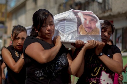El ataúd de la abuela Minerva encabezaba la fila de cajas formadas en un predio aledaño a la que fue su morada. De las cajas pendían, para diferenciarlas, fotografías de cada víctima.