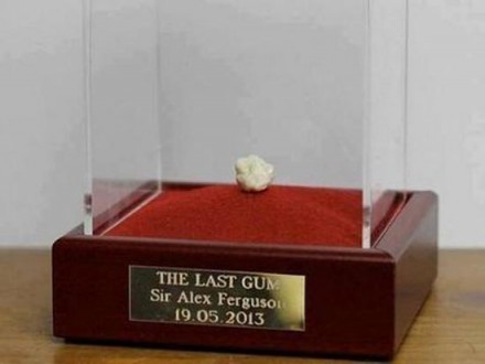 El último chicle de Ferguson, quien renunció a la dirección técnica del Manchester United después de 26 años, permanece en un cuadro de cristal con base de madera.