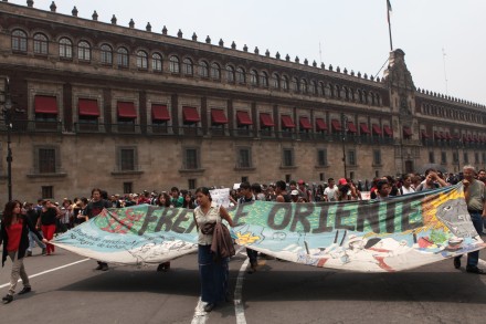 Poco después de este mediodía, unas 100 personas marcharon del Palacio de Bellas Artes al Zócalo para exigir la liberación, sin pago de fianza, de los siete detenidos.