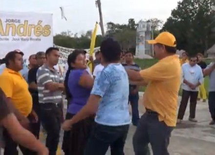 CANCÚN, Q. Roo., (proceso.com.mx).- La subdelegada de la comunidad San Isidro Lázaro Cárdenas, Petrona Uluac, golpeó al candidato de la alianza de facto a la presidencia municipal de José María Morelos en un mitin en el parque central de esta comunidad.