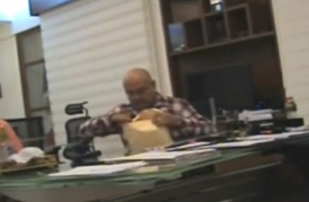 “Son tres”, se escucha. Ricalde toma uno y casi de inmediato lo devuelve. Hernández lo introduce de nueva cuenta y le entrega el sobre al hoy alcalde. “Es de los impuestos, es de hoy”, se le escucha decir. Ricalde toma el paquete y lo pone a un lado.