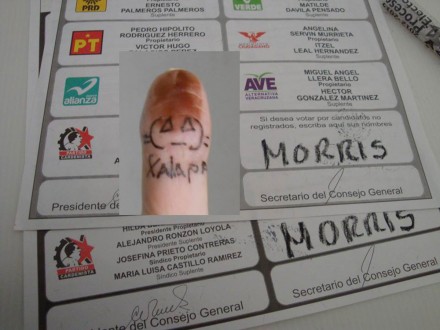 En dicha colección fotográfica aparecen incluso xalapeños con el dedo pulgar manchado con tinta indeleble y ataviados con su playera de “Morris”.