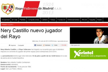 “Nery Alberto Castillo y el Rayo Vallecano han llegado a un acuerdo para que el delantero mexicano se convierta en jugador del primer equipo para la temporada 2013-2014”.