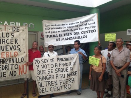 La mañana del jueves 4, decenas de ciudadanos se congregaron en las instalaciones del ayuntamiento para protestar por la realización de las obras. Sus pancartas decían: “Fuera el tren del centro de Manzanillo”. Los vecinos advirtieron a la presidencia municipal que si no clausura la obra, ellos lo harían el lunes 8.