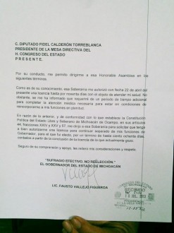 MORELIA, MICH., (proceso.com.mx).- A las 12:35 horas, el Congreso del estado recibió la petición de segunda licencia del gobernador Fausto Vallejo Figueroa, de manos del subsecretario de Enlace Legislativo, Rubén Pérez-Gallardo Ojeda.