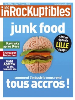 El número 902 de Les inrockuptibles, que acaba de mandarme Patrick Servot desde La Manche, destaca en portada el reportaje de esta edición pre-veraniega: Junk food, o sea “Comida chatarra”, sobresaliendo una entrevista con el periodista Michael Moss, Premio Pulitzer 2010, quien menciona acerca de cómo las industrias agroalimentarias nos llenan de grasa para engordarnos, y así nos convierten en adictos a sus productos chafas.