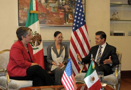La visita de Napolitano también sirvió de motivo para que los integrantes del gabinete de seguridad se dieran cita en la Secretaría de Gobernación y, posteriormente, acudieran a la residencia oficial de Los Pinos, donde la representante del presidente Barack Obama sostuvo un encuentro con el mandatario mexicano.