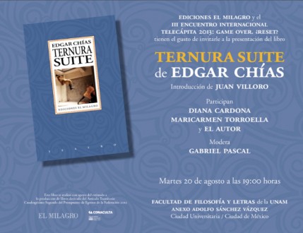 MÉXICO, D.F. (proceso.com.mx).- Ternura Suite, de Edgar Chías, es el más reciente libro de Ediciones El Milagro que reproduce su obra teatral y que acaba de ser presentado en el anexo Adolfo Sánchez Vázquez de la Facultad de Filosofía y Letras de la UNAM.