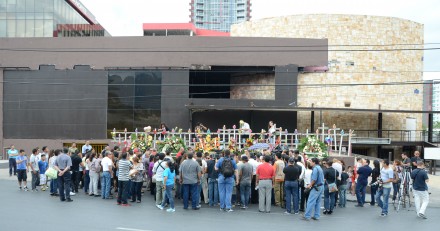 Una hora después, las imágenes fueron retiradas y los reunidos se trasladaron en una procesión doliente, por la avenida San Jerónimo hacia las instalaciones del Casino Royale que luce, en el exterior, cruces de madera con los nombres de 52 muertos.