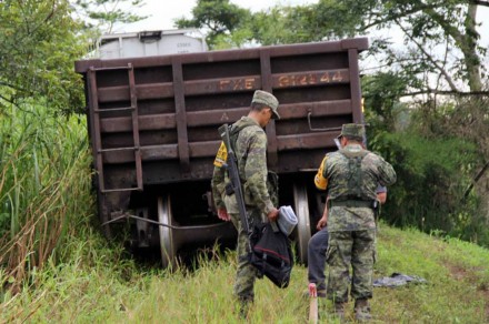 VILLAHERMOSA, Tab. (apro).- El robo de una planchuela, pieza metálica que une dos rieles, así como los tornillos que la fijan, provocó el descarrilamiento de La Bestia la madrugada del domingo 25 en la comunidad conocida como La Tembladera del municipio de Huimanguillo, Tabasco.