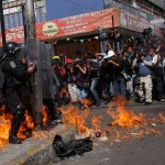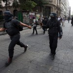 Los docentes procedentes de Guerrero, Oaxaca, Michoacán y Chiapas se replegaron, no participaron en los disturbios, pero sí jalonearon a algunos anarquistas para que se salieran de su grupo. En tanto, los policías avanzaron en bloque unas cuadras. Todos corriendo, protegiéndose de los estallidos, mientras que los jóvenes con el rostro cubierto enfrentaban a golpes a los granaderos.