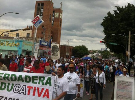 GUADALAJARA, Jal. (apro).- Integrantes de Bases Magisteriales, padres de familia y alumnos de diversas escuelas paralizaron el centro de Guadalajara al realizar una marcha de protesta por aprobación de las reformas en materia educativa, en lo que representa la segunda movilización en menos de una semana.