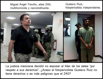 En una imagen comparativa entre Miguel Ángel Treviño, El Z-40 y el fotógrafo Gustavo Ruiz, se lee: “La justicia mexicana decidió no esposar al líder de Los Zetas por respeto a sus derechos. ¿Acaso el fotoperiodista Gustavo Ruiz no tiene derechos o es más peligroso que el Z-40?”.