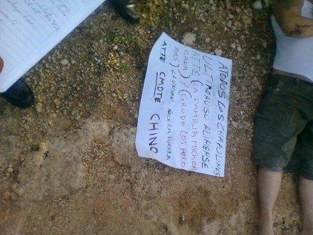 “A TODOS LOS CHAPULINES ULTIMO AVISO ALINIENSE ATTE (LA FAMILIA MICHOACANA) Y (GRUPO DE LOS PELONES) LA UNION HACE LA FUERZA ATTE: CMDTE CHINO”, dice el mensaje escrito en una cartulina, que los sicarios dejaron a una lado del cuerpo.