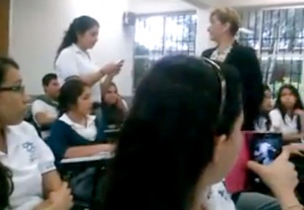 Luego la maestra saca su teléfono celular y cuestiona a la alumna por qué escribió ofensas en su contra en la red social. Luego, Hernández le dice al resto de los estudiantes que Marina la insultó a través de Twitter.